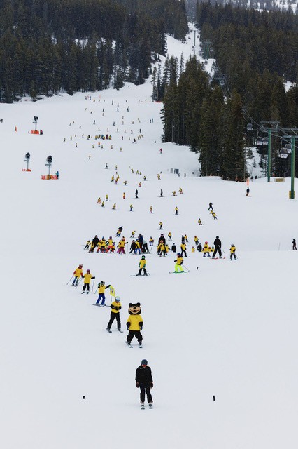 Since that first Invitational in 2004, the race has become an event that many clubs look forward to every year, with over 300 young athletes taking part as was the case this past weekend. It is a 2-day event, the most memorable highlight of which sees every racer taking part in a parade down the front side of the mountain via Easy Street, led by club mascot Grizz of course, and sporting bright yellow t-shirts to celebrate Doug’s favourite colour.